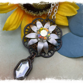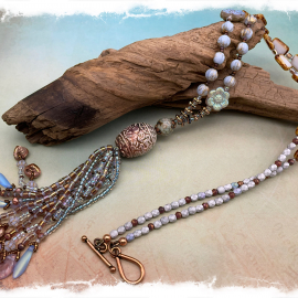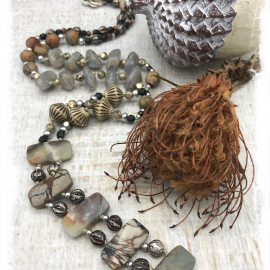 This gorgeous apple blossom agate pendant has been carved into a grafeful feather and edged in plated gold. Just beautiful in shades of dusty sage green, frosted ivory, with hints of pale gray and taupe. I had some lovely matte adventurine marquise shape stones that are a perfect compliment in shape and color, they were meant to play along! It's all hand-knotted on pale gray cord, with pretty frosted round Czech glass beads and tiny gold/brass bicone spacers, along with silver seed beads. It's a great gift idea for you or someone you love. The stone pendant measures nearly three inches and has a large gold cap. The necklace is 26" and ends with a silver plated toggle. Combining a bit of both silver and gold makes it versatile to wear with either color earrings. All of these hand carved stones are unique; you won't see this onw any where else.