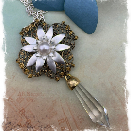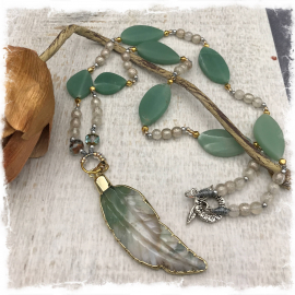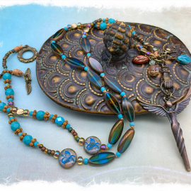 I've had this unique hand made porcelain bead in my stash for some time, i purchase i made in Springdale Utah while on a visit to Zion Natinal park .I loved the colors and texture, but was uninspired to dao anything with it until I bought some new beads recently.. Eh Voila! It all came together in a magical way. The palette is is soothing and a bit mystical - pearlized white, softest blue, light copper, matte silver, and an earthy brown. The necklace is composed entirely of Czech glass, and the pretty hand- sewn tassel has seed beads strands theat end inglass leaves and daggers. wouldn't this be pretty with a chambray or white sundress? The necklace fastens with a solid copper toggle and measures about 34" long, the tassel and focal bead come in at 4". This is the perfect way to welcome a new seaso!