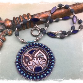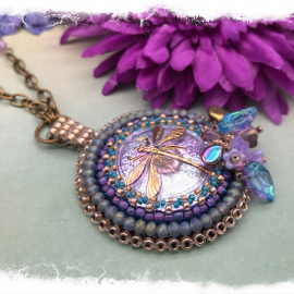 For centuries, dragonflies have symbolized new beginnings, living in the moment, adaptability, and finding inner peace. That's a lot for a tiny insect to balance on gossamer wings! I use them often in my jewelry designs, I like those positive vibes. This gorgeous hand painted Czech glass button embraces all of that with it's cool, ethereal color palette. The base is a beautiful rose violet and pale blue turquoise and the dragonfly is painted in antique gold. I've surrounded it with aqua-lined purple seed beads and tiny faceted blue crystals and finished the edge with soft gold seed beads. There's a hand-sewn flourish of Czech glass flowers, petals, and leaves that add some pretty embellishment. The brass chain has stations of faceted round and pale violet crystals. The twenty inch chain closes with a lobster claw clasp and has a 1 1/2" extender. The button pendant is about 1 3/4" wide. This would make a glorious gift for a gardener, or something lovely to remind you of warmer days and the beauty of real dragonflies.